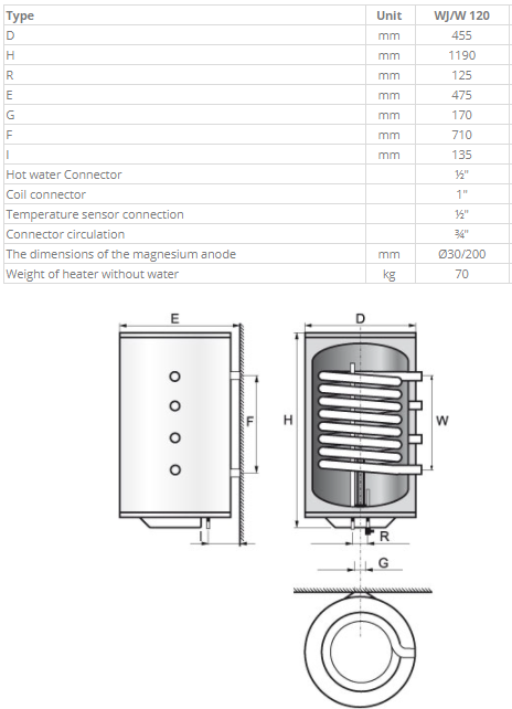 Nominalus vandens šildytuvo tūris 112 l, šilumokaičio plotas 0,9 m2, tūris – 5,7 litrai.